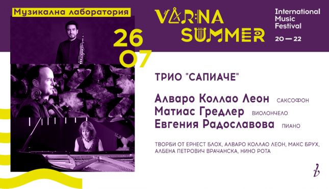 На 26 юли от 19.00 ч. в Градската художествена галерия ще се представи трио „Сапиаче” в състав Алваро Коллао Леон - саксофон, Евгения Радославова – пиано и утвърдения Матиас Гредлер – виолончело, съобщават организаторите за Moreto.net.