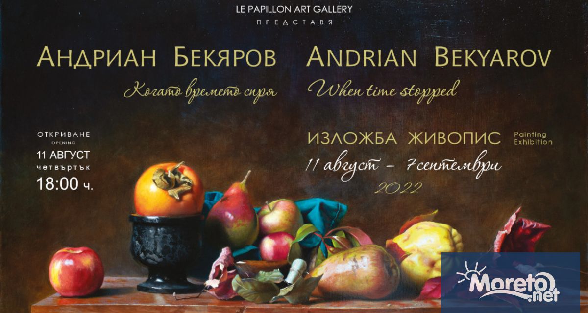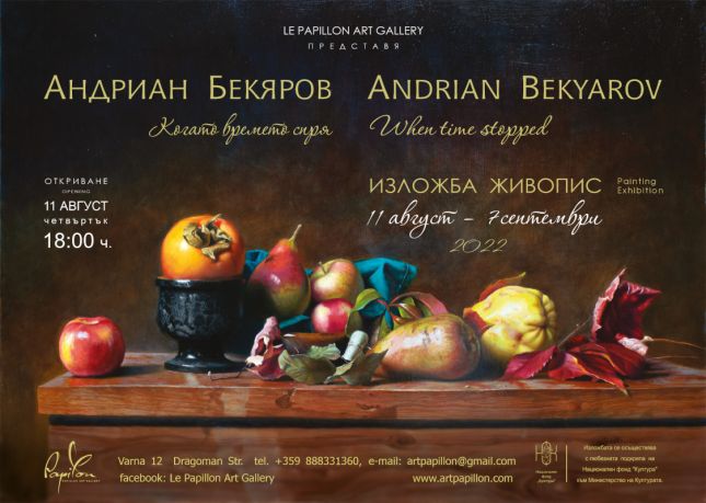 Арт галерия Le Papillon с голямо удоволствие представя от 11-ти август до 7-ми септември 2022 финия лиричен реализъм в творбите на Андриан Бекяров. Подготвените картини за изложбата са виртуозно изпълнени в характерния за него детайлен реализъм, както в маслена, така и в акварелна техника и са обединени от темата „Когато времето спря". Прецизният му маниер и фин рисунък показват безспорен талант, търпение, пълна отдаденост към детайла и любов към изкуството. Сюжетите на неговите произведения издават отношението му към класическия начин на изграждане на картина и най-вече светоусещане на съзерцател, оценяващ преходността на красотата на момента. Нима ние също не изпитваме потребност да спрем времето, когато омаята на тишината, красотата на съвършения миг, дори когато той е привидно обикновен и тривиален ни завладее? Този момент на спокойствие, душевна хармония и тайнственост ни носят разнообразните по тема картини, подбрани за изложбата „Когато времето спря", издаваща неговата поетична и емоционална натура, чиято живопис разказва отвъд видимото. Общата нишка е лиричната природа на автора и мълчаливото присъствие на наблюдателя между всички тях. Творбите на художника внушават вътрешен мир и спокойствие - лаконични, без излишен драматизъм, но с внушение за простор, изпълнени дори в различни техники - маслена, рисунка с туш и перо, смесена техника с моливи, както и в разпознаваемия стил на Бекяров на мекота и дълбочина на изграждане на акварела. В тази изложба усещаме „Лятото" и в планинските и в морските пейзажи – и в масло и в акварел, усещаме физически аромата на зрелите ябълки, като откраднат момент от „Нощна градина", носталгичните нотки в „Капитанска среща", но и в „Светлината от миналото", както и страстта на художника към детайла, естествено предизвикваща нашето възхищение. Чувството за душевна хармония и смиреност на твореца е силно и открояващо се във всичките му творби. Сякаш времето е застинало и е настъпил момента на съзерцание, който да ни пренесе отвъд ежедневните мисли.
