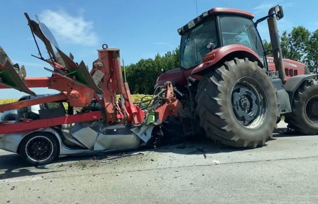 Според очевидци вероятно лекият автомобил е изпреварвал с висока скорост, а селскостопанската машина е завила наляво към нивата.