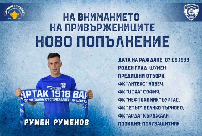 Румен Руменов ще подсили халфовата линия. 29-годишният полузащитник подписа договор за срок от 2 г.
