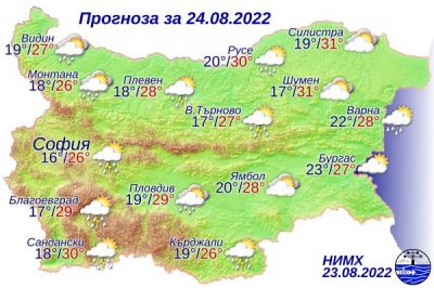 През деня облачността ще бъде предимно значителна, в следобедните часове и до полунощ ще е купесто-дъждовна. На много места ще има краткотрайни валежи от дъжд придружени с гръмотевици. В планинските райони явленията ще са временно интензивни. Дневните температури слабо ще се повишат и максималните ще са предимно между 26° и 31°, в София - около 26°.