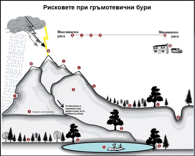 1. Ако се намирате сред природата по време на гръмотевична буря, постарайте се да застанете далеч от високи дървета. При наличие на сух предмет, седнете върху него.