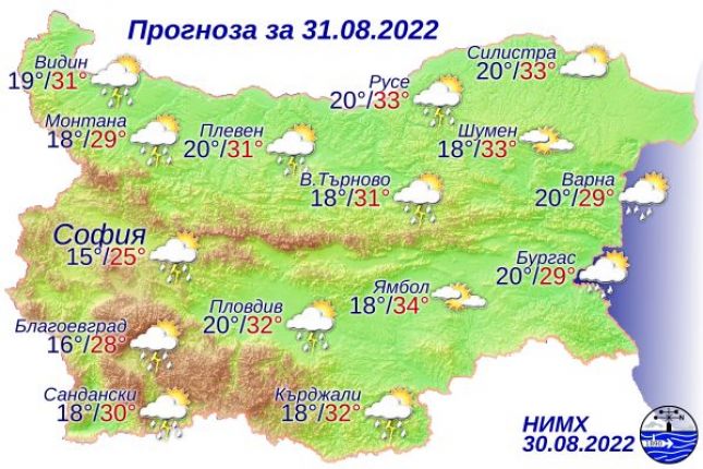 През първата половина на нощта, на места в Западна и Централна България, все още ще има превалявания от дъжд. В края на нощта и в сутрешните часове облачността над източните райони временно ще се увеличи и на места по Южното Черноморие и Странджа ще превали и прегърми. Утре до обяд над по-голямата част от страната ще е предимно слънчево. Следобед отново ще се развива купеста и купесто-дъждовна облачност и на много места, главно в Западна и Централна България, ще превали и прегърми. Вятърът ще е слаб със северна компонента. Максималните температури ще са между 25° и 30°, в низините на Източна България до 33-34°, в София - около 25°.