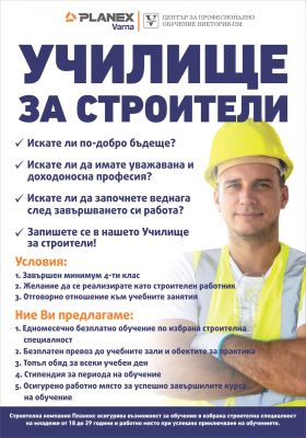 Строителна компания Планекс и Център за професионално обучение Виктория – ПМ осигурява възможност за обучение в избрана строителна специалност на младежи от 18 до 29 години и работно място при успешно приключване на обучението. За контакт: milkova@planex.bg