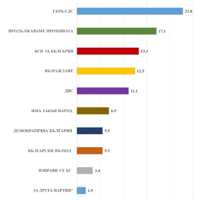 БСП, ДПС и "Възраждане" се борят за трето, четвърто и пето място с изравнени позиции, по данни от изследването.