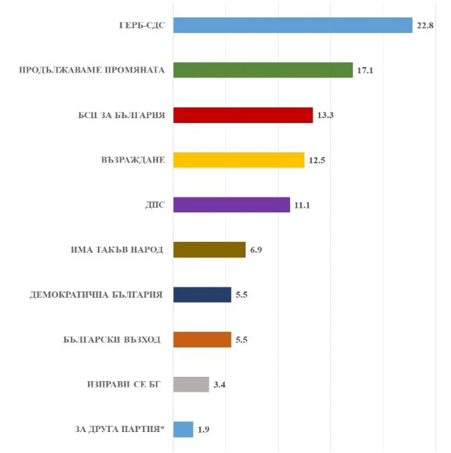 Мненията на анкетираните определят, че партия ГЕРБ води с близо 6% пред "Продължаваме промяната".