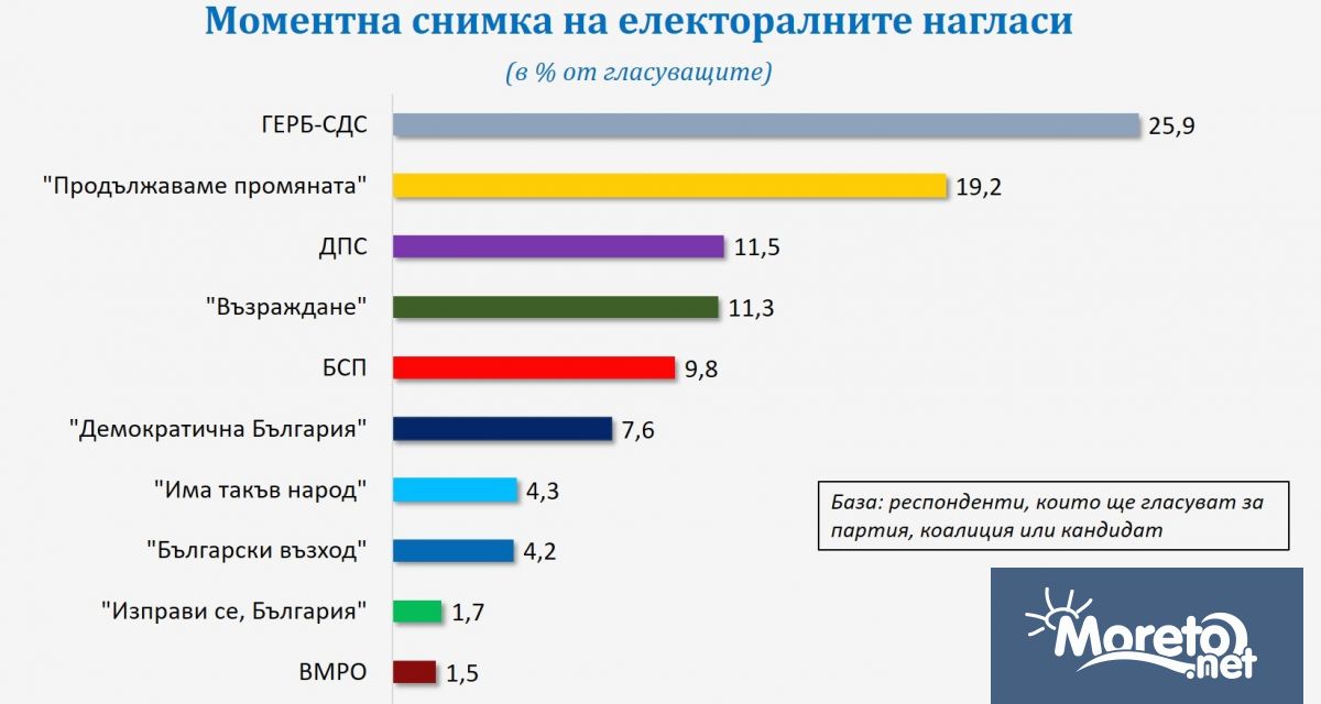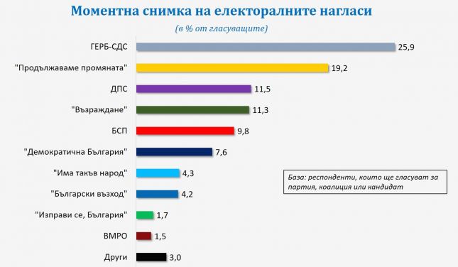 Ако изборите бяха в първата десетдневка на септември, ГЕРБ-СДС биха получили 25,9% от потенциалните гласове, „Продължаваме промяната“ – 19,2%. Тези две формации са в главната битка в тази кампания и подредбата им ще зависи от степента, в която ПП успее или не успее да мобилизира привържениците, с които разполага, да гласуват. ГЕРБ от своя страна изглеждат в достатъчна степен консолидирани, макар видимо да не растат.