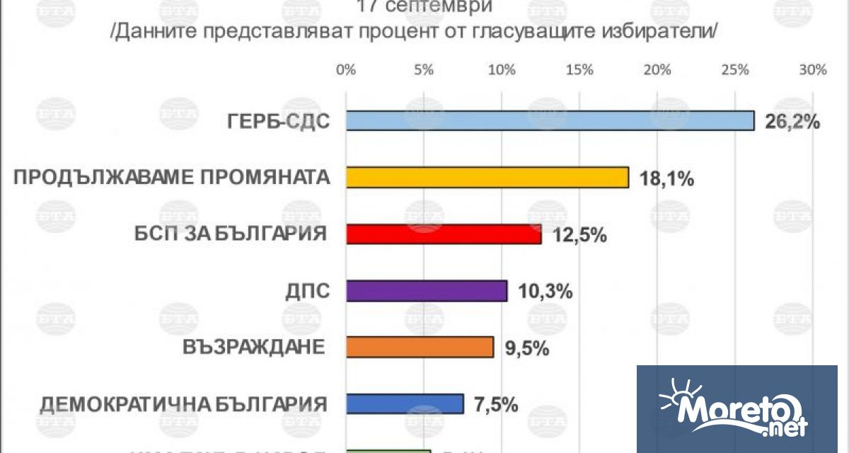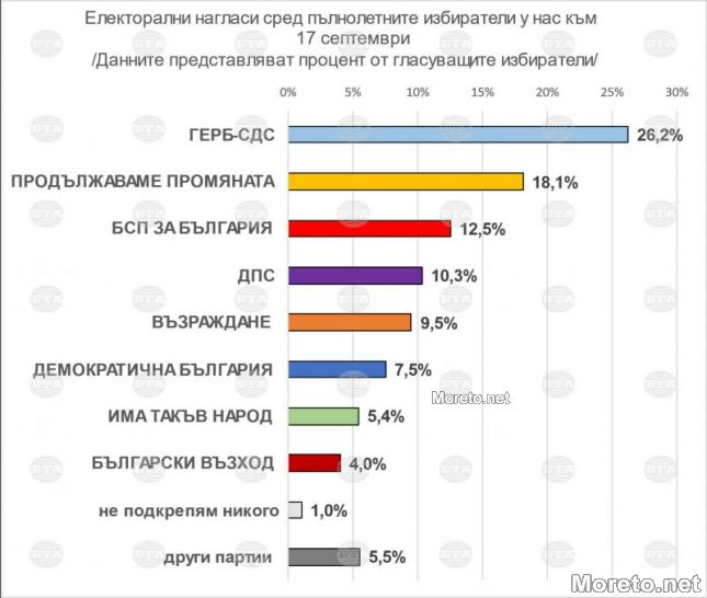 Данните за електоралните нагласи към 17 септември показват, че ГЕРБ–СДС е с дял от 26,2% от гласуващите българи. Втора политическа сила са „Продължаваме промяната” с резултат сред гласуващите от 18,1%. Трети са "БСП за България" с резултат от 12,5%, четвърти – ДПС с резултат от 10,3%, пети са "Възраждане" с резултат от 9,5% от гласуващите. Следва "Демократична България" с резултат от 7,5%.