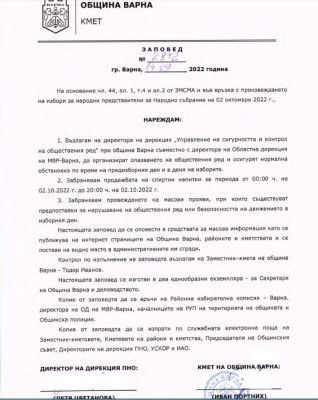 Опазването на обществения ред и осигуряването на нормална обстановка по време на предизборния ден и деня на вота е възложена на директора на Дирекция "Управление на сигурността и контрол на обществения ред" и директора на ОД на МВР - Варна, е написано още в заповедта на Иван Портних.