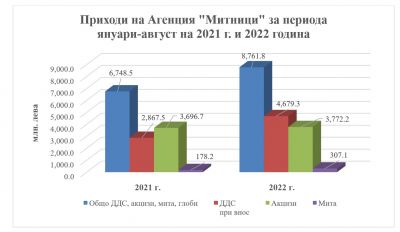 За осемте месеца на годината Агенция „Митници” е събрала 8761,8 млн. лева. приходите от акцизи, ДДС при внос, мита и глоби. Спрямо същия период на 2021 г. постъпленията са нараснали и с 2013,3 млн. лева или 29,8%.