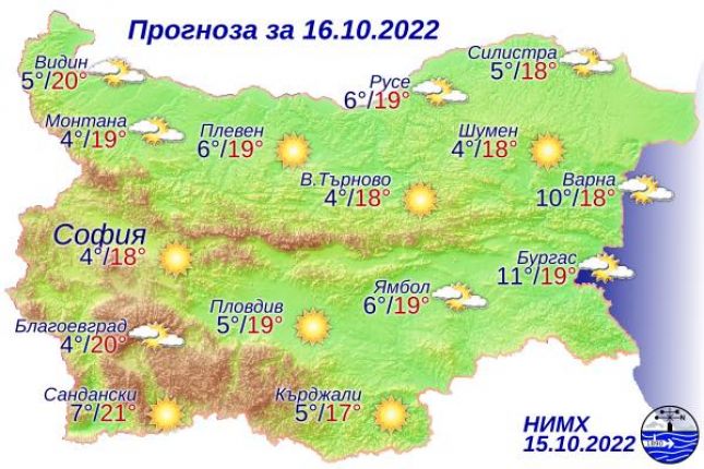 През нощта облачността и над Източна България ще намалее и над страната ще бъде предимно ясно. В повечето райони вятърът временно ще стихне, само в Източна България ще се задържи слаб от североизток. Минималните температури ще бъдат между 3° и 8°, по Черноморието до 10°-14°; в София - около 4°. Утре над страната ще бъде предимно слънчево. Преди обяд на места в котловините и около водните басейни ще има мъгла. Ще духа слаб, в източните райони до умерен североизточен вятър. Максималните температури ще бъдат между 16° и 21°, в София - около 18°.