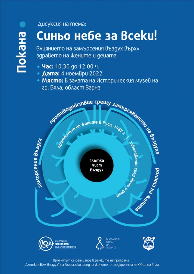 На 4 ноември от 10.30 до 12.00 ч. в Музея на град Бяла, област Варна, ще се проведе дискусия на тема „Синьо небе за всеки. Влиянието на замърсения въздух върху здравето на жените и децата“