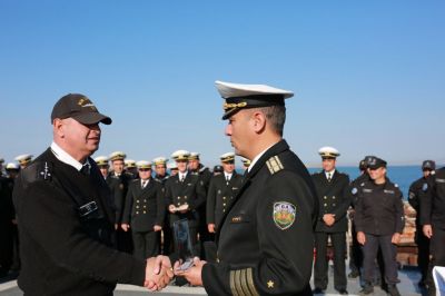 Капитан II Стоян Христов връчи почетни плакети на моряците от първия екипаж на кораба, които са го приели от ВМС на Кралство Белгия и са го пребазирали от военноморска база Зеебрюге до вмб Бургас и все още служат на фрегата „Дръзки“.
