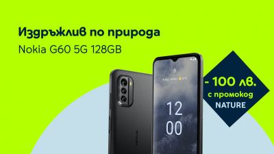 Стандартната цена на NOKIA G60 5G 128GB е 379,99 лв. в брой с договор за 2 години и план Тотал Макс 55.99 или на изплащане за 18,99 лв. на месец за 24 месеца. До края на ноември обаче потребителите могат да го вземат със 100 лв. отстъпка от цената в брой от онлайн магазина на Yettel с промокод NATURE.