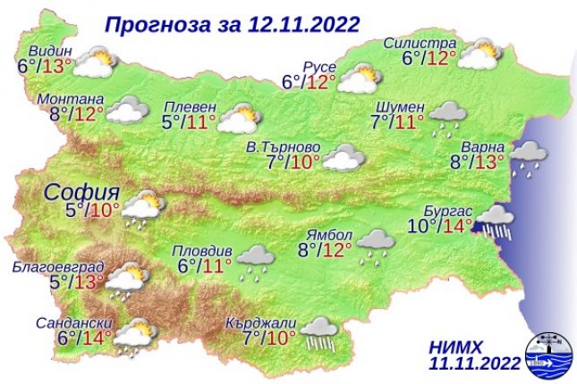 Утре над Черноморието ще е предимно облачно. На много места ще има валежи от дъжд, по-значителни до обяд по южното крайбрежие. Ще духа умерен вятър от север-североизток. Максималните температури ще са между 12° и 16°. Температурата на морската вода е 16-17°. Вълнението на морето ще се усили и ще е 3-4 бала.