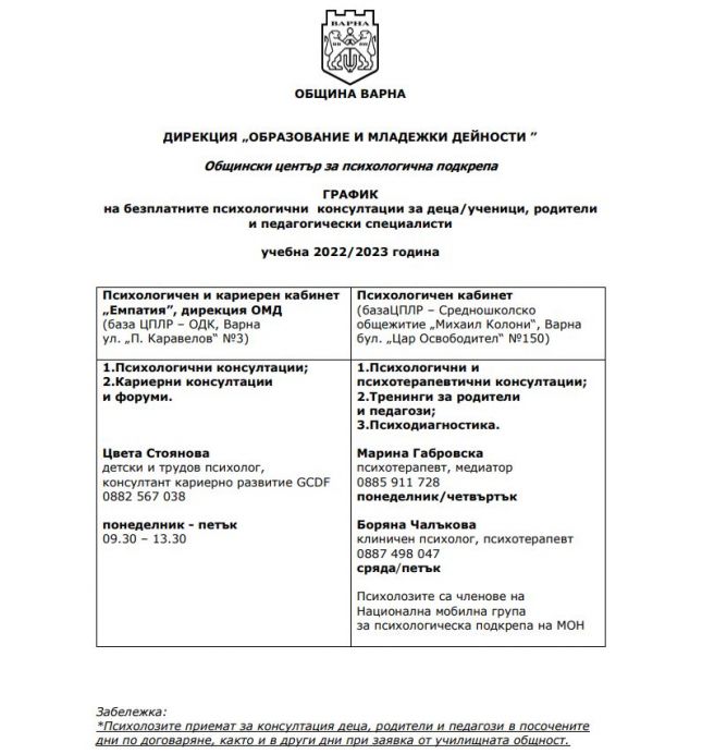 Общинският център за психологична подкрепа работи с деца, ученици, родители и педагогически специалисти и през учебната 2022/2023 г., съобщиха от дирекция „Образование и младежки дейности“ към Община Варна.