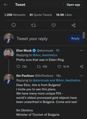 След коментара на Мъск министърът на туризма Илин Димитров покани милиардера да дойде в България и да разгледа забележителността.