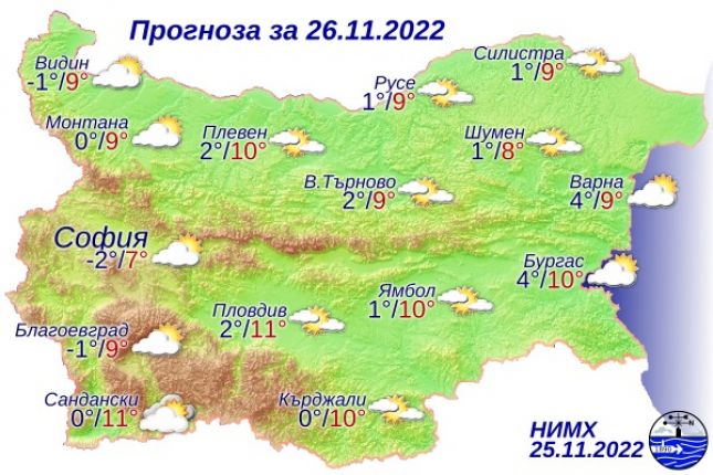 През нощта облачността над по-голямата част от страната ще намалее до предимно ясно. Вятърът ще отслабва и в повечето райони ще стихне. Сутринта ще е студено с минимални температури между минус 3° и 2°, по морския бряг до 5-6°, в София - около минус 2°. Утре ще е предимно слънчево. По-значителни увеличения на облачността ще има над Западна България, но валежи не се очакват. След обяд ще духа слаб северен вятър. Максималните температури ще са между 6° и 11°, в София - около 7°.