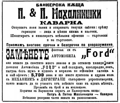 „Заменете файтона си с автомобил Форд. Ако искате да спестите много левове и да останете хиляди пъти доволни. Автомобил Форд е най – солиден, извънредно лек, пътува без шум и пушек и миризма по всякакви пътища, а и е най – евтин: 5700 лева и ще имате луксозна и здрава кола с механизъм и диригиране съвършено упростотворени, които могат да се усвоят от всякого само по един месец. Продажба в брой и на изплащане. Всякакви резервни части винаги на разположение.“, се казва в рекламата.