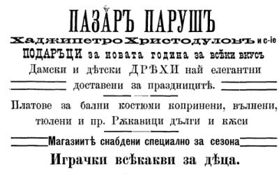 „Подаръци за Новата година за всеки вкус. Дамски и детски дрехи най – елегантни доставени за празниците. Платове за бални костюми. Играчки всякакви за деца.“