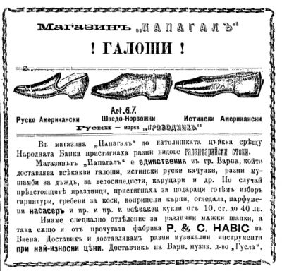 Магазин „Папагал“ пък предлага галоши и отбелязва, че е единственият в града, който предлага всякакви модели – от руско – американски до истински американски.