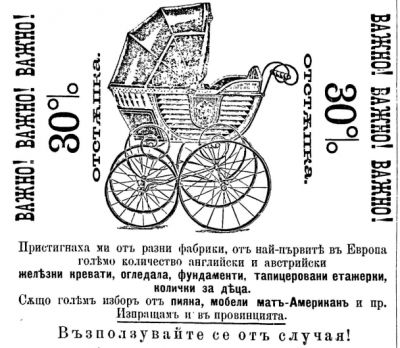 „Важно! 30% отстъпка. Пристигнаха ми от разни фабрики, от най – първите в Европа голямо количество английски и австрийски железни кревати, огледала, фундаменти, тапицеровани етажерки, колички за деца. Също голям избор от пияна, мобели мат – Американ. Изпращам и в провинцията. Възползвайте се от случая. С почитание Йосиф Хершман.“, пише в реклама от началото на миналия век.