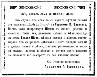„Ново! 25% отстъпка само за Велик ден. Ето случай отсега да си купите ефтини работи от магазин „Добър Густ“ на Герасимо Василато, като например: шапки с хиляди фасони и качества, ризи, яки, ракавели бели и цветни последна мода, връзки Шик, цъпици дамски и детски, гарантирани от фабриката „Херман хърш“, чадъри мъжки и дамски, зимни и летни. Бастуни разновидни, чорапи мъжки, дамски и детски и всичко друго каквото ще поискате ще намерите с най – износни цени.“, гласи друга обява за празнично намаление.