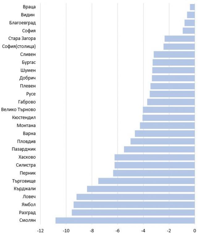Очаквано най-добре се справя Враца - с едва 0,4 пункта изоставане, благодарение на доброто представяне на енергийния сектор през годината. Сходни резултати постигат и Видин, Благоевград и София. От другата страна са Смолян, Разград, Ямбол и Ловеч, където забавянето спрямо инфлацията е с почти 10 пункта.