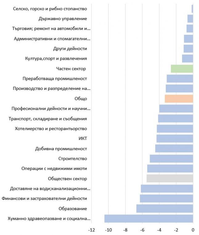 Сред отделните сектори, най-малко изоставане има при селското стопанство, държавното управление и търговията, най-големи – в здравеопазването и образованието. Голямото забавяне при болниците и училищата потвърждава наблюдението, че бюджетната сфера не успява да реагира навременно на свиването на реалните заплати на работещите в нея. Обратно, аусторсинг секторът и преработването като цяло се справят относително добре. Въпреки това няма нито един отрасъл на българската икономика, в която ръстът на заплатите да надхвърля този на потребителските цени и да реализира ръст на покупателната способност.