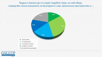 46,2% от интервюираните смятат, че влизането на България в Шенгенското пространство е в една или друга степен важно. Една трета са повече или по-малко на обратното мнение. Присъства и немалък дял – 21,3% – от респондентите, които не могат да преценят.