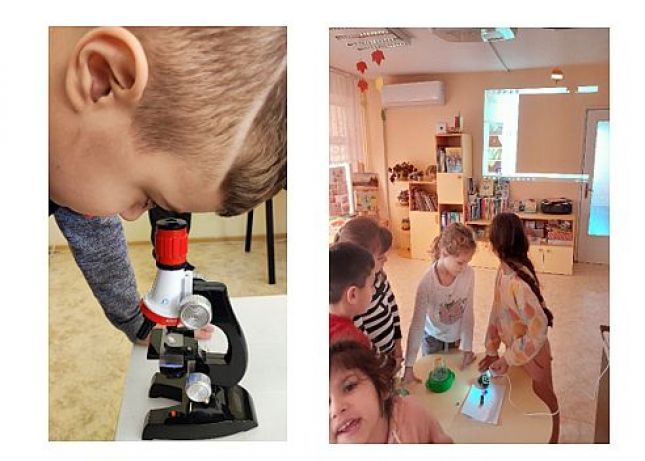 По Дейност „ Експериментирам и откривам“- децата и от трите ПГ проследяваха, анализираха и извеждаха логически изводи, следствие на експериментална дейност. Тази дейност осъществиха с образователните продукти – лесноскоп, лупи, микроскоп, щипки, микроскоп с двойно виждане. Бяха в ролята на изследователи и научни работници, като изследваха различни части на растения и животни.