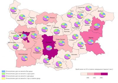 При жените с три и повече деца най-висок е относителният дял в областите Кърджали (21.1%), Сливен (15.5%), Търговище (14.6%) и Разград (14.2%), а най-нисък - в областите Габрово (6.0%), Перник (5.9%) и София (столица) - 4.6% от всички жени на 12 и повече навършени години в областта.
