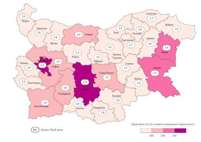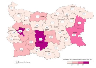 Налице са разлики и в средния брой на децата по области. Най-висок е той в областите Кърджали (1.81) и Сливен (1.70). Общо в 23 области този показател е над средния за страната (1.47). Под средния за страната са 5 области, като най-нисък е броят на децата в област София (столица) - 1.18 деца.