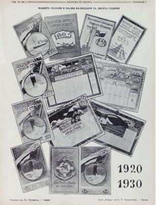 Джобно календарче с орнаменти от платноходки върху развълнувано море, рисувани от мариниста Александър Мутафов е издаден още през 1923 г. Подобни други календарчета, образци на графичното майсторство, е имало и за годините 1924, 1925 и 1926.