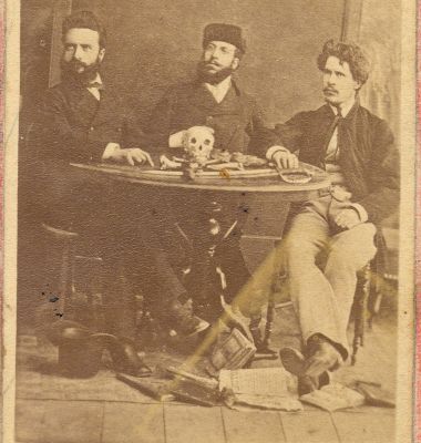 Христо Ботев заедно с Никола Славков и Иван Драсов, седнали около маса, на която са сложени череп, пистолет и сабя