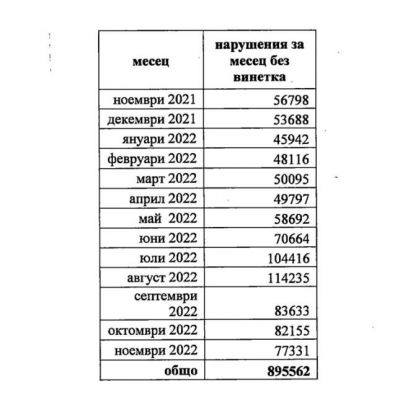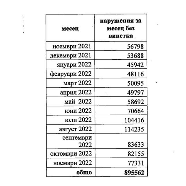 Прави впечатление, че ако през ноември 2021 г. нарушенията са били 56 798, то за същия месец на 2022-ва те са 77 331, без да е ясно на какво се дължи това увеличение с над 20 000 броя. Притеснително е също, че ако от ноември 2021 г. до май 2022 г. нарушенията средно месечно са били около 50 000, то след месец юни те скачат до над 80 000 бр. средно месечно.