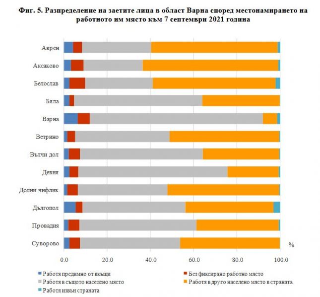 Най-нисък е относителният дял на заетите лица в област Варна, които пътуват в друго населено място, за да работят, в общините Варна - 6.7%, Девня - 23.7% и Вълчи дол - 35.4%. Най-голям е делът на трудовите мигранти в общините Аксаково - 62.7%, Аврен - 58.5%, Белослав - 56.7% и Долни чифлик - 51.4%.