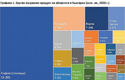 Икономиката на София (столица) логично е на първо място, сочи доклада на Института по пазарна икономика, научи Moreto.net. Докато Брутният вътрешен продукт (БВП) на Варна е 7 346 млн.лв., БВП на София (столица), въпреки пандемията, е над 51 млрд. лева през 2020 г., което представлява 42,8% от икономиката на България. Столичната икономика е над пет пъти по-голяма от икономиката на област Пловдив и седем пъти по-голяма от икономиката на област Варна. Високият растеж в националната икономика през 2021 година - над 7,6 реален и 15,3 номинален ръст на БВП, предполага и много висок ръст на икономиката на София, която най-вероятно достига нива от близо 60 млрд.лв. през 2021 г.