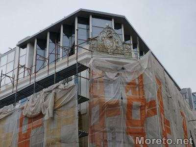 Фасадата следва да бъде запазена в първоначалния ѝ вид. На какъв етап е работата по нея към момента не може ясно да се проследи, защото все още има опънати обезопасителни платна.