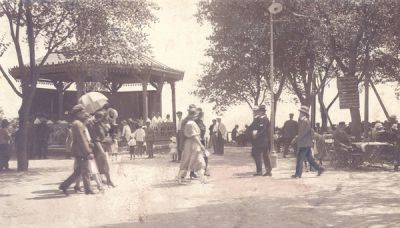 “Цялата градина тогава се състоеше от сбутана в един кът, без план насадба с малка барака, служаща за бюфет и пред нея ”карък” от насаден чемшир по средата с шадраванче, бликащо из кепчини сталактити. Из пътеката, около шадраванчето имаше сложени масички и сламени столчета, гдето мъже и жени, насядали, дишаха морския въздух и си приготовляваха апетита…”.