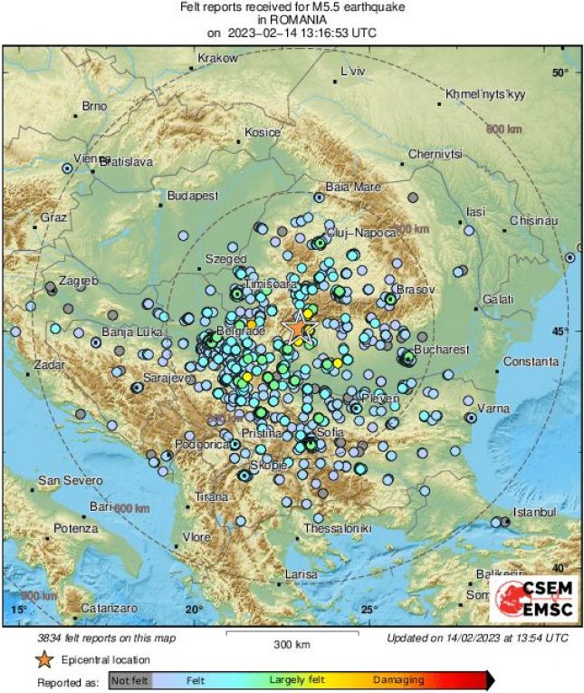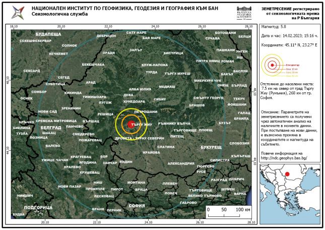 По данни на Националния сеизмологичен център към НИГГГ-БАН на 14.02.2023 г. е регистрирано земетресение с магнитуд 5.8 по Рихтер в района на град Търгу Жиу, Румъния. Събитието от 15:16 часа българско време е с епицентър, близко до земетресението от вчера, което беше слабо усетено в северозападната част на страната.