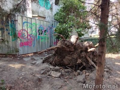 Огромно изкоренено дърво се с стоварило върху фасадата и покрива на къщата на Антон Новак в Морската градина, видя репортер на Moreto.net.