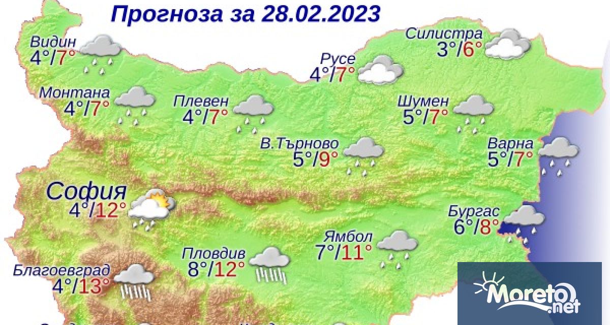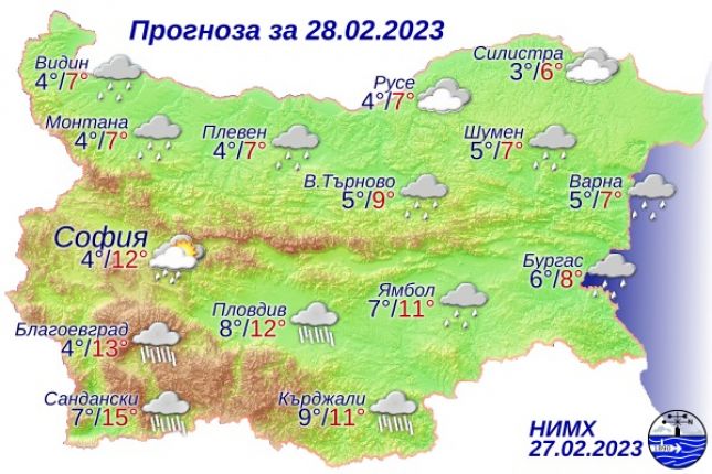 През следващото денонощие ще е предимно облачно. През нощта на много места ще има валежи от дъжд, но до сутринта ще отслабват и в повечето райони ще спрат. Вятърът ще се ориентира от изток-североизток, ще е слаб до умерен, така ще се задържи и през деня. Минималните температури ще са предимно между 3° и 8°, в София около 4°.