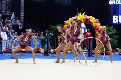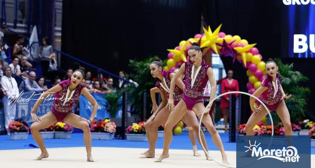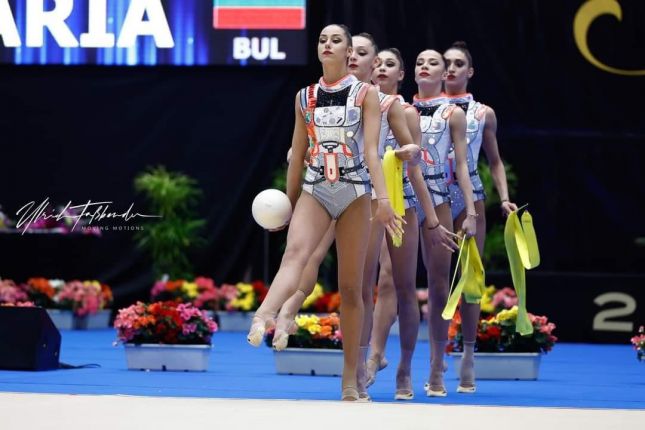 Отборът, воден от Весела Димитрова и Михаела Маевска, получи за изпълнението си днес на пет обръча оценка от 35.250 точки, а на ленти и топки - 29.700.