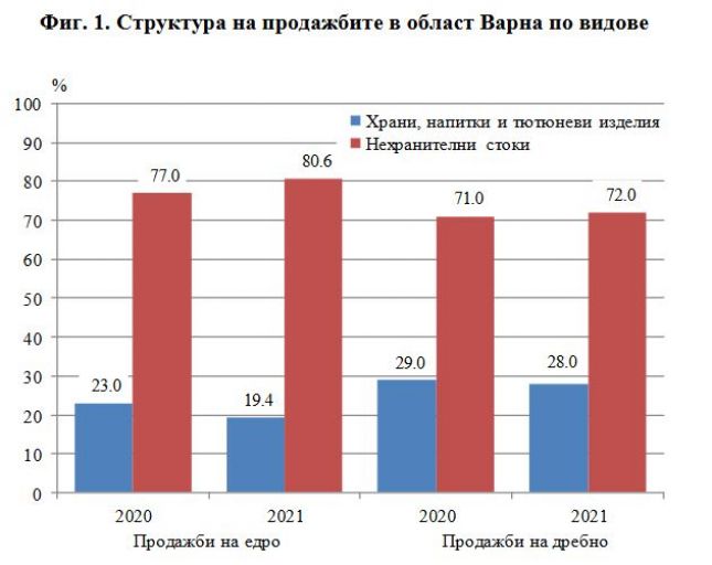 Продажбите на дребно (вкл. ДДС и акцизи) са на стойност 3 451 млн. лв., като отново преобладават нехранителните стоки с дял от 72.0%. В сравнение с 2020 г. обемът на продажбите на дребно в номинално изражение нараства с 12.2%, като е отчетен ръст на продажбите на дребно на нехранителни стоки с 13.8% и на продажбите на храни, напитки и тютюневи изделия с 8.2%.