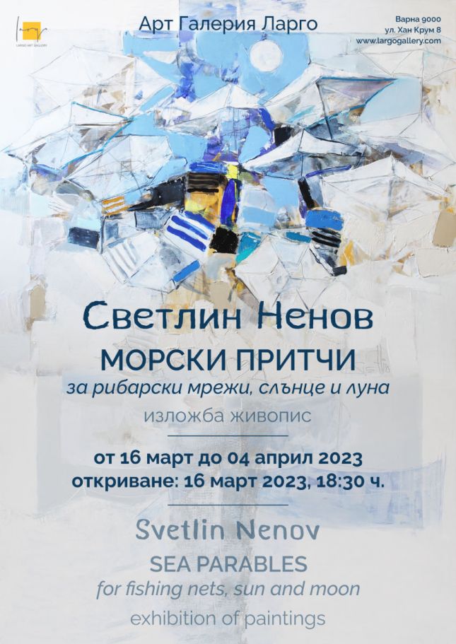 След доста дълга пауза от 4 години, днес, 16 март 2023 от 18:30 часа Арт Галерия Ларго ще представи за четвърти път в своите изложбени салони със самостоятелна изложба обичаният варненски художник Светлин Ненов. Експозицията е озаглавена „Морски притчи“, с подзаглавие, подсказващо основните теми в изложбата: „за рибарски мрежи, слънце и луна“. Варненския автор е изключително известен именно с морските си сюжети. Роден във Варна, Светлин не може да избяга от силната връзка с морето, което го е вдъхновявало в годините, вълнува го и до днес, и е непрекъснат извор на идеи за неговите картини.