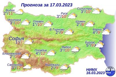 През нощта ще се задържи облачно с превалявания от дъжд, на места главно из високите полета на Западна България и в Предбалкана примесен със сняг. Вятърът ще е до умерен от североизток. Минималните температури ще са между минус 1° и 4°, в София - около 0°. Утре още сутринта валежите в повечето райони ще спрат и до края на деня облачността ще се разкъсва и намалява. Ще продължи да духа североизточен вятър, ще е до умерен, в Източна България - временно силен, но вечерта ще отслабне. Максималните температури ще са между 7° и 12°, в София - около 7°.