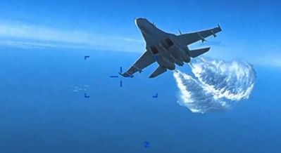 Според европейското командване на САЩ обаче един от двата руски изтребителя Су-27 е ударил витлото на дрона, за да се разбие той в Черно море.