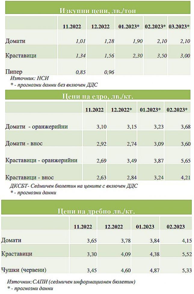 През м.февруари 2023 г. най-голямо увеличение на цените на едро се отчита при краставиците, които в европейски план се оказаха с най-високо повишение и същевременно в най-доходоносния оранжериен зеленчук през този сезон. При цените на дребно за домати поскъпването е с 8% за месец, докато при краставиците цените скачат с 26%.