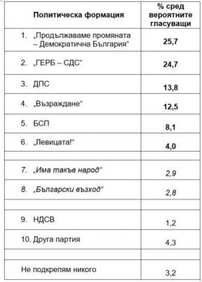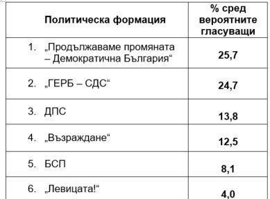 Обединението между Промяната и дясната коалиция има 25,7 % от гласовете, а ГЕРБ-СДС – 24,7 на сто от гласовете.